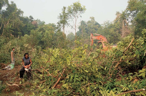 인도네시아 칼리만탄 지역에서 일꾼들이 열대우림의 나무들을 베어내고 있다. 전세계 열대우림의 10%를 가지고 있는 인도네시아 정부는 기름야자 플랜테이션을 만들기 위해 지속적으로 열대우림을 개발해왔다. 개발은 파괴의 다른 이름이다. REUTERS/ HARDI BANKTIANTORO
