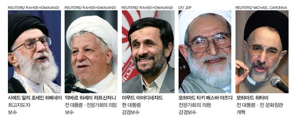 나라 안에서도 변화의 기운이 느껴진다. 아마디네자드 대통령은 애초 2005년 6월17일 치러진 대통령 선거 1차투표에서 19.43%의 득표를 얻으면서 2위에 그쳤다. ‘온건 보수파’로 불리는 악바르 하셰미 라프산자니 전 대통령보다 50만 표가량 뒤처진 게다. 하지만 불과 일주일 뒤 치러진 결선 투표에서 그는 61.69%의 득표를 올리며 낙승했다. 보수 성향의 표가 그에게 몰린 탓이다. 하지만 오는 6월 치러질 제7대 대통령 선거에선 조금 다른 상황이 연출될 가능성이 엿보인다. 집권 보수 진영 내부, 최고지도자 하메네이를 정점으로 한 세력과 아마디네자드 대통령으로 대표되는 ‘신보수’ 진영이 벌써 2년여째 은밀한 권력투쟁을 이어온 탓이다.