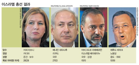 ‘가자전쟁’의 포연이 채 가시지 않은 상황에서 치러진 이번 총선은 적어도 두 가지 점에서 앞서 발표된 여론조사 결과를 비웃었다. 첫째, 사상 최저치를 기록할 것이란 전망과 달리 투표율이 65%를 웃돌며 예년 수준과 비슷하게 나타났다. 둘째, 베냐민 네타야후 전 총리가 이끄는 우파 리쿠드당이 넉넉하게 제1당에 오를 것이란 전망도 빗나갔다. 치피 리브니 외교장관이 이끄는 집권 카디마당이 박빙의 승부 끝에 1석 차로 제1당 지위를 유지한 게다. 카디마당은 기존 의석보다 1석이 줄어든 28석을, 리쿠드당은 무려 15석을 보탠 27석을 얻었다.