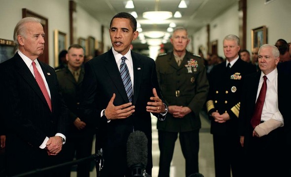 ‘아프간, 오바마의 전쟁?’ 지난 1월28일 국방부 청사를 방문한 버락 오바마 미 대통령(앞줄 왼쪽 두 번째)이 로버트 게이츠(맨 오른쪽) 국방장관 등 군 관계자들을 만난 자리에서 새 행정부의 군사안보 정책에 대해 밝히고 있다. REUTERS/ JIM YOUNG