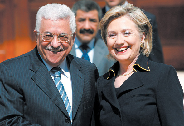 ‘가자엔 3억달러, 서안엔 6억달러!’ 힐러리 클린턴 미 국무장관(오른쪽)이 3월4일 요르단강 서안을 방문해 마무드 아바스 팔레스타인 자치정부 대통령과 환한 웃음으로 인사를 나누고 있다. 사진 EPA/ ATEF SAFADI