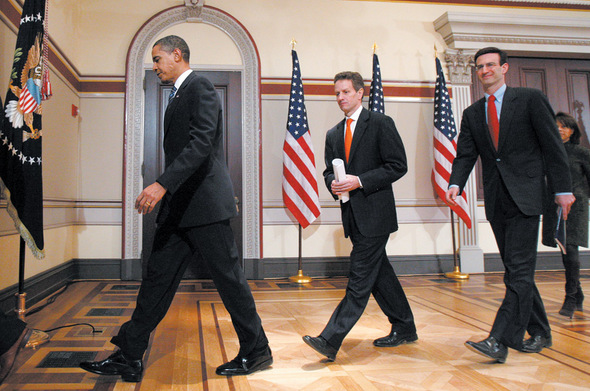 ‘위기는 진정성을 시험하는 기회다.’ 버락 오바마 미 대통령(왼쪽)이 지난 2월26일 티머시 가이트너 재무장관(가운데) 등과 함께 취임 뒤 첫 예산안의 얼개를 발표한 뒤 회견장을 빠져나가고 있다. 사진 REUTERS/ JIM YOUNG