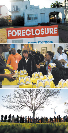 경제위기의 그늘이 갈수록 짙어지고 있다. 눈먼 호황의 끝에서 대출금을 갚지 못하는 이들이 늘면서 주택 가압류가 줄을 잇고 있다. 신발이며 옷가지, 먹을거리 따위를 나눠주는 노숙인 지원센터가 붐비기 시작한 건 이미 오래다. 삽시간에 실업자로 전락한 이들이 일자리 박람회 참석을 위해 기다랗게 줄을 늘어서는 건 미국 전역에서 흔히 볼 수 있는 풍경이 됐다(맨 위부터). 사진 REUTERS/ CARLOS BARRIA