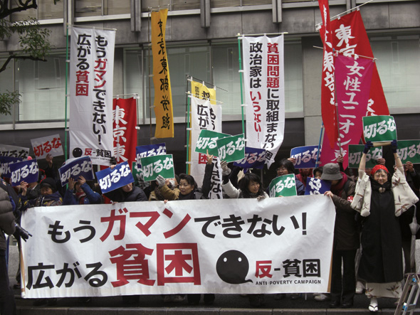 “더 이상 참을 수 없다, 확대되는 빈곤.” 반빈곤네트워크 활동가들이 도쿄의 경단련 앞에서 비정규직 노동자 대량해고 사태를 비판하는 집회를 하고 있다.