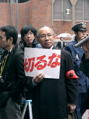 ‘빈곤을 보이게 하자!’ 사회 안전망 확대를 촉구하는 집회에 참석한 우쓰노미야 겐지 반빈곤네트워크 대표가 ‘자르지 마라’는 글귀가 적힌 손팻말을 들어 보이고 있다.