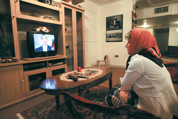 ‘누루즈’는 봄의 시작. 새 출발을 알리는 명절이다. 지난 3월20일 이란 수도 테헤란의 한 가정집에서 머리에 스카프를 두른 이란 여성이 위성방송을 통해 버락 오바마 미 대통령의 ‘누루즈 축하 메시지’를 지켜보고 있다. 사진 AP PHOTO/ VAHID SALEMI