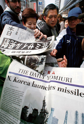 ‘이번엔 진짜일까?’ 북한이 로켓을 발사한 지난 4월5일 오후 일본 도쿄 중심가인 긴자에서 시민들이 각 언론사가 발행한 호외판 신문을 앞다퉈 집어들고 있다. 일본 언론들은 전날에도 ‘북한이 로켓을 발사했다’는 오보를 내 소동이 나기도 했다. 사진 연합뉴스 박지호 기자