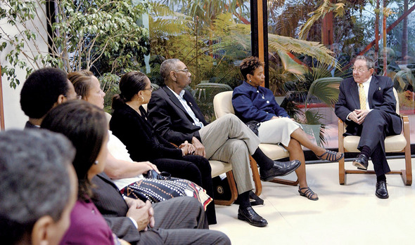 ‘반세기 요지부동이던 얼음이 녹기 시작한다.’ 친형인 피델 카스트로에 이어 쿠바를 이끌고 있는 라울 카스트로 국가평의회 의장(맨 오른쪽)이 지난 4월6일 아바나를 방문한 미 하원 대표단과 만나 두나라 사이 현안에 대해 얘기를 나누고 있다. 사진 REUTERS/ JUVENAL BADAL
