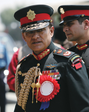 군 수뇌부 반대로 군 통합계획 지지부진루크만구드 카타왈 네팔 육군 참모총장이 지난 4월24일 수도 카트만두에서 열린 ‘민주주의의 날’ 행사에 참석했다. 카타왈 참모총장은 정부군과 마오주의 반군을 통합하라는 명령에 “세뇌된 자들과 같은 군복을 입을 수 없다”며 완강히 버티고 있다. 사진 REUTERS/ GOPAL CHITRAKAR