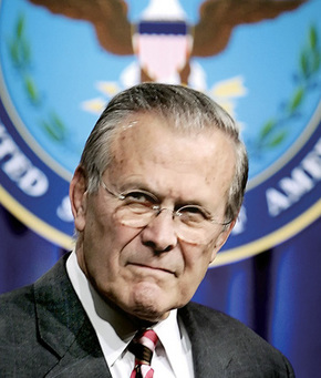 ‘선지자 럼즈펠드?’ 도널드 럼즈펠드 전 미 국방장관은 이라크 침공을 전후로 직접 준비해 조지 부시 전 대통령에게 보고한 ‘정보 업데이트’의 표지에 <성서>에서 따온 구절을 적어 넣었다. ‘신념의 전쟁’이다. 사진 REUTERS/ JIM YOUNG
