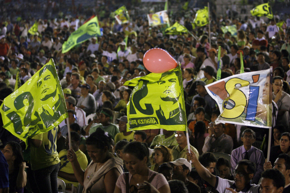 지난해 9월 말 에콰도르 과야킬 지역의 알베르토 스펜서 경기장에서 열린 집회에서 참석자들이 개헌을 지지하는 구호를 외치고 있다. 물 사유화 금지를 포함한 국민의 사회·경제적 권리 확대를 뼈대로 한 당시 개헌 투표에서 에콰도르 국민 절대다수가 찬성표를 던졌다. 사진  REUTERS/ GUILLERMO GRANJA