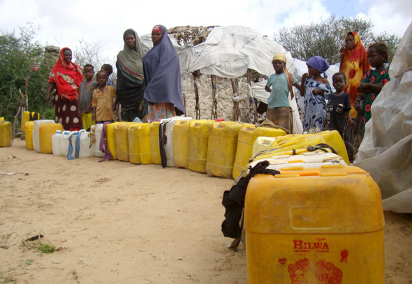 지난 9월4일 소말리아 수도 모가디슈 외곽 아프고예 부근 난민캠프에서 피난민들이 물통을 길게 늘어놓은 채 급수 차례를 기다리고 있다. 사진 REUTERS/ FEISEL OMAR