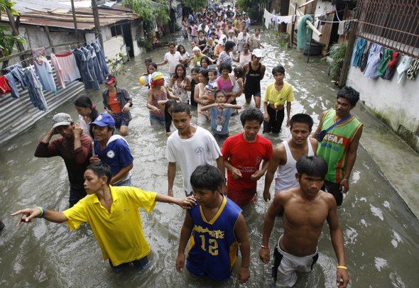 제16호 태풍 켓사나가 휩쓸고 간 자리. 아직 물도 채 빠지지 않은 필리핀 수도 마닐라 동부 파테로스 지역에서 9월30일 이재민들이 구호물품을 받기 위해 재난구호 사무소로 향하고 있다. 사진 REUTERS/ ROMEO RANOCO