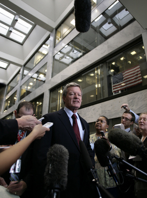 ‘의료 개혁 6인방’의 수장 격인 맥스 바커스 미 상원 재정위원장이 지난 9월14일 의료보험 개혁법안과 관련한 회의를 마친 뒤, 의사당 로비에서 회의 결과를 묻는 기자들의 질문에 답하고 있다. 사진 REUTERS/ YURI GRIPAS