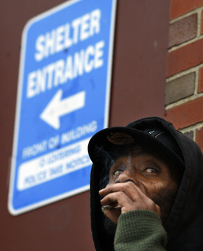지난 11월18일 미 동부 로드아일랜드주 크랜스턴 지역의 쉼터 앞에서 한 노숙인이 처연한 표정으로 담배를 피워물고 있다. REUTERS / BRIAN SNYDER