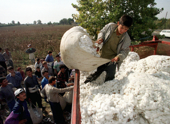 우즈베키스탄 수도 타슈켄트 남부지역의 면화밭에서 한 소년이 트럭 위에 올라 갓 거둬들인 면화 더미를 부리고 있다. 여물지 않은 손으로 추수한 면화에서 실이 뽑히고, 그 실로 짠 옷감으로 어딘가에서 또 다른 아이들이 재봉틀을 돌리고 있다. REUTERS/ SHAMIL ZHUMATOV