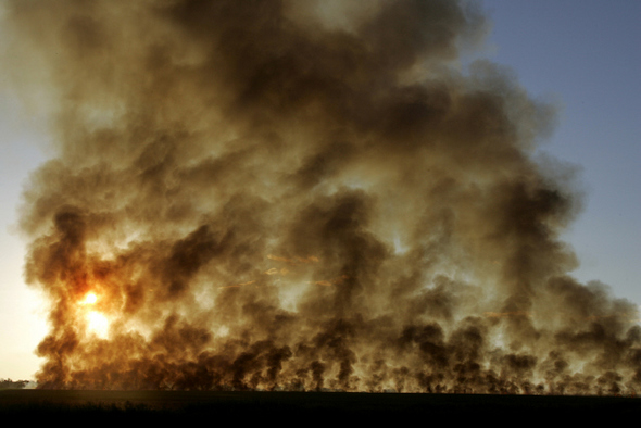 ‘불타는 사탕수수 밭, 치솟는 온실가스.’ 브라질 상파울루 북동부 세르탕지뉴 지역의 광활한 농장에서 추수에 앞서 바이오 연료 생산에 필요한 줄기만 남기고 이파리 등을 제거하기 위해 농부들이 불을 지른 사탕수수밭이 활활 타오르고 있다. REUTERS/ PAULO WHITAKER