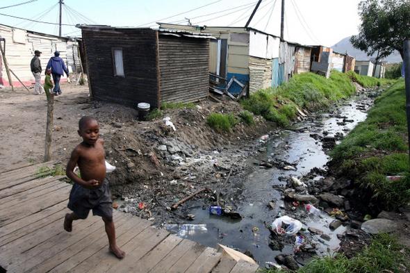 ‘떠나라, 국가의 품격을 위해!’ 남아공 케이프타운의 마시푸멜레레 빈민촌에서 윗옷을 입지 않은 소년이 쓰레기로 덮인 개천을 지나고 있다. 월드컵 개막을 앞둔 남아공에서 빈민촌은 ‘감춰야 할 비밀’로 전락했다. 연합 EPA