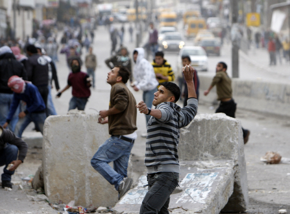 동예루살렘에서 촉발된 시위 사태는 요르단강 서안으로 빠르게 퍼져나갔다. 서안의 라말라 외곽 칼란디야 검문소 부근에서 팔레스타인 젊은이들이 이스라엘군에 맞서 짱돌을 던지고 있다. REUTERS/ MOHAMAD TOROKMAN