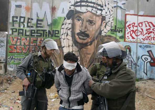 ‘사로잡힌 저항, 가려진 분노.’ 지난 3월19일 팔레스타인 땅 요르단강 서안지구의 라말라 외곽 칼란디야 검문소 부근에서 투석전을 벌이던 팔레스타인 젊은이가 중무장한 이스라엘 경찰에게 체포돼 눈이 가려진 채 어디론가 끌려가고 있다. REUTERS/ MOHAMAD TOROKMAN