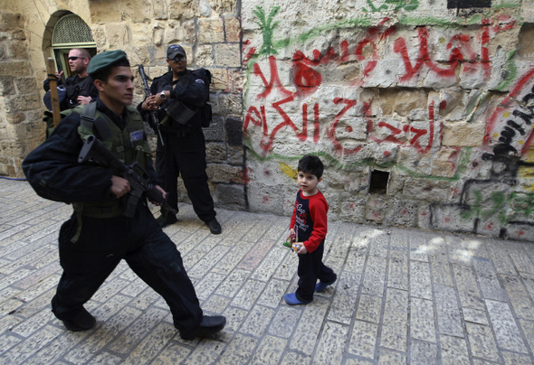 ‘인티파다, 원천봉쇄.’ 팔레스타인 땅 동예루살렘의 옛 도심에서 자동소총으로 무장한 이스라엘 경찰이 순찰을 돌고 있다. REUTERS/ AMMAR AWAD