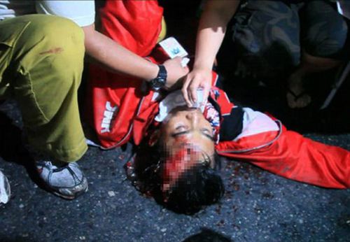 방콕 민주탑 부근 콕쿠아 교차로에 부상당한 시민이 쓰러져 있다. 그는 곧 사망했다.