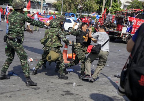 4월10일 방콕의 유혈사태는 타이 현대사에서 ‘암흑의 날’로 기록될 것이다. 방콕 시내에서 진압에 나선 군이 시위 참가자 한 명을 폭행하고 있다.