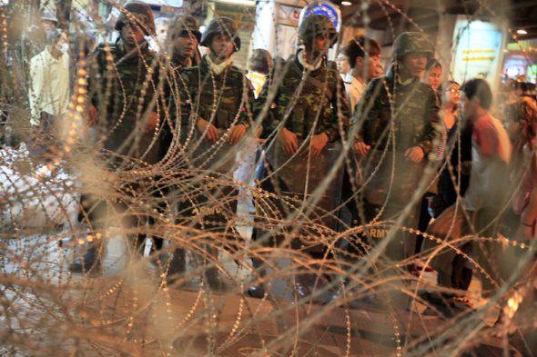 정부의 무력 진압이 입박했다는 소문이 나돌면서 매일 밤 붉은 성은 긴장감에 휩싸인다. 이 구역을 무력으로 진압한다면 그야말로 엄청난 인명 피해를 피할 길이 없어 보인다. 붉은 셔츠의 ‘중무장‘은 사실 4월19일 군인들이 실롬가를 부분 점령해 들어오면서 시작된 현상이다. 사망자 25명, 부상자 800여 명의 큰 인명 피해를 낸 4월10일의 유혈사태에도 불구하고 붉은 셔츠를 진압하는 데 실패한 군은 8일을 병영에서 지냈다. 그러다 방콕의 금융가인 실롬을 보호하겠다며 19일 탱크를 몰고 다시 거리로 돌아왔고, 아이러니하게도 군의 복귀는 ‘멀티컬러 셔츠’라 불리는 ‘실롬 주민’ 시위대를 불러왔다.
