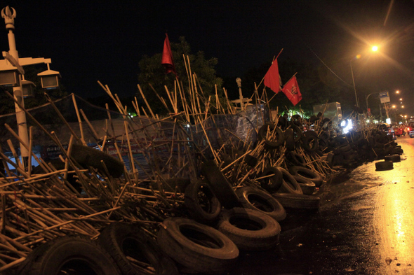 실롬가와 맞닿은 살라댕 교차로를 포함해 붉은 셔츠는 6개의 바리케이드를 세워놓았다. 죽창과 트럭 타이어로 세운 바리케이드에는 기름을 부어 공권력과 ‘안티 레드’ 시위대의 접근을 막고 있다.