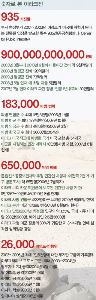 이라크 침공과 점령 7년5개월이 남긴 논란거리들, 그리고 이라크와 전세계가 입은 상흔을 중요한 사건들과 반드시 기억해야만 할 통계와 문서들을 통해 살펴보기로 한다.