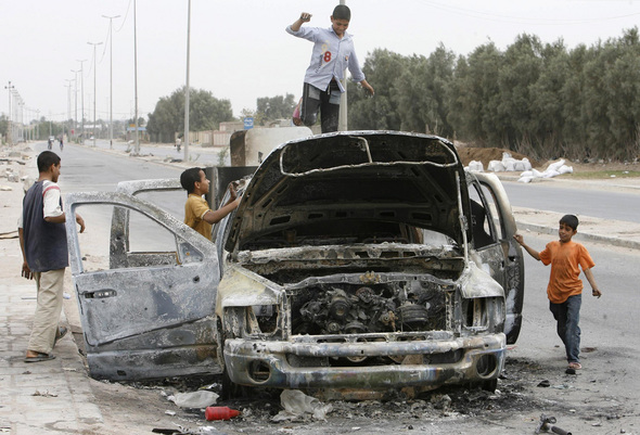 2008년 3월28일 이라크 정부군과 반군의 교전 중에 파괴된 자동차에서 어린이들이 놀고 있다. 2007년 현재 이라크 어린이들의 28%가 만성적인 영양실조에 시달리고 있다. REUTERS/ ATEF HASSAN