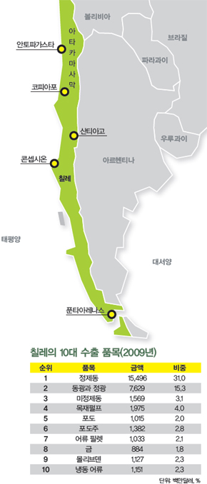 칠레는 얘기가 다르다. 칠레는 와인이 아니라 구리로 먹고산다. 구리 생산 세계 1위. 세계 구리 소비량의 35% 이상을 공급한다. 구리는 2009년 칠레 수출의 49.4%를 차지했다. 칠레 하면 와인을 떠올리는 사람이 많지만, 와인은 칠레 수출품목 가운데 6위로 비중이 2.8%밖에 안 된다. 수출품목 1위가 정제동, 2위가 동광(銅鑛)·정광(精鑛), 3위가 미정제동이다(표 참조). 모두 구리와 구리가 포함된 광석이다. 광업은 2008년 칠레 GDP의 17.5%를 차지했다.