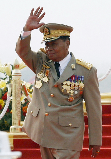 버마 군사정권의 최고 권력기구인 국가평화발전평의회(SPDC) 의장 탄 슈웨 장군이 지난 3월27일 ‘국군의 날’에 벌어진 행진에서 손을 들어 보이고 있다.REUTERS/ SOE ZEYA TUN