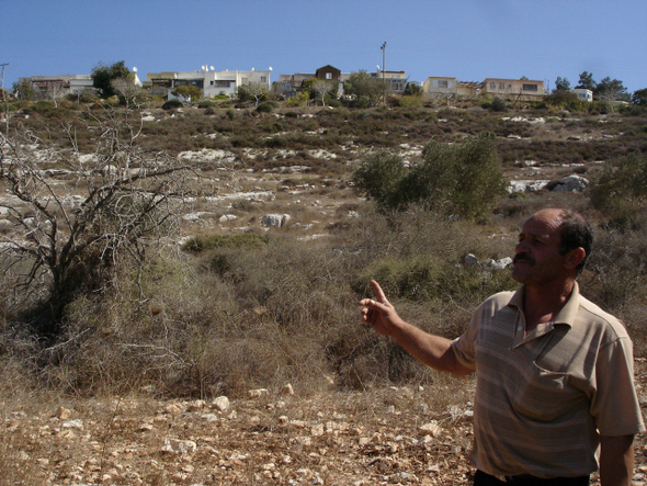 카프르카둠 마을 자치위원회 부위원장인 사커가 이스라엘 점령촌을 가리키며 팔레스타인 주민들의 힘겨운 삶을 설명하고 있다.국제여성평화서비스 제공