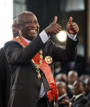 로랑 그바그보 대통령이 12월4일 아비장의 대통령궁에서 강행한 대통령 취임식에서 엄지손가락을 치켜들고 기뻐하고 있다.