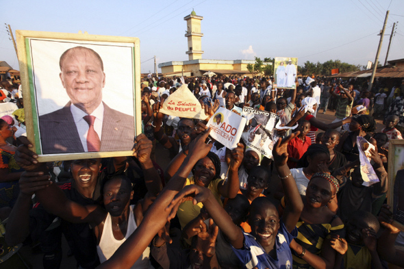 코트디부아르에 두 명의 대통령이 등장했다. 그중 한 명인 알라산 와타라 전 총리의 지지자들이 12월2일 로랑 그바그보 현 대통령의 고향 마을인 가그노아의 거리 한복판에서 와타라 지지 시위를 벌이고 있다.
