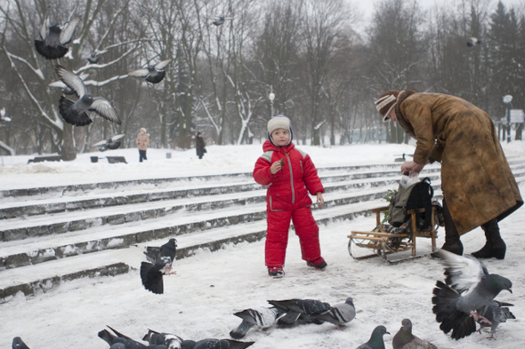 대선 부정 항의시위 현장에서 검거된 안드레이 산니코프 전 대선 후보의 아들 다닐이 1월8일 벨라루스 수도 민스크의 한 공원에서 놀고 있다. 연합 THE NEW YORK TIMES