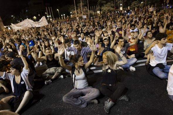 스페인 시위대가 6월13일 수도 마드리드의 시청 앞에 모여서 정부의 긴축재정과 경제위기 대응 및 정당 부패 등에 항의하는 시위를 벌이고 있다. 연합 AP