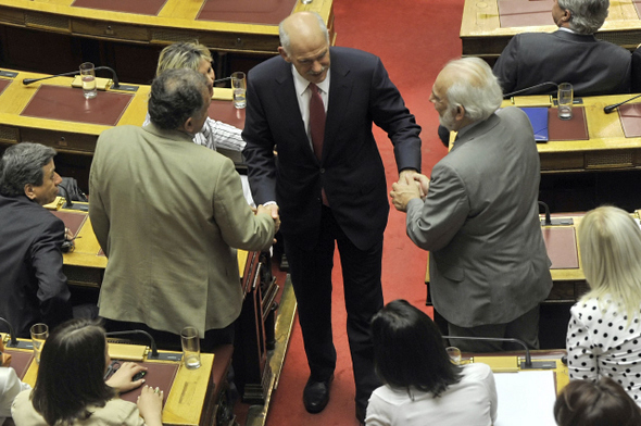 6월22일 그리스 의회에서 내각 신임투표가 통과된 뒤 게오르기오스 파판드레우 총리(가운데)가 동료 의원들의 축하를 받고 있다. 연합 AFP