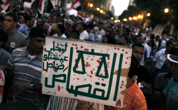 이집트 수도 카이로 타흐리르 광장에서 7월12일 한 시위 참가자가 “정의가 아니면 총알을”이라고 적힌 손팻말을 들고 있다. 연합 AP
