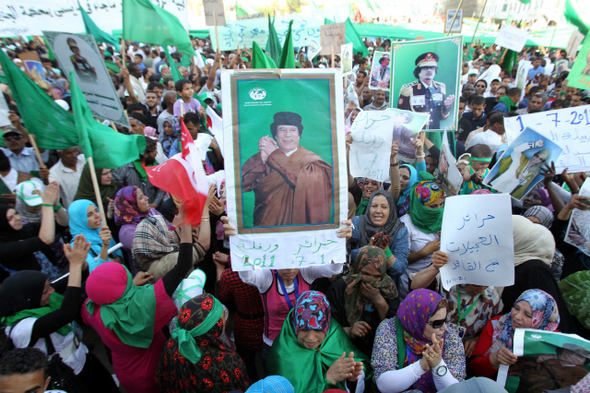 리비아 수도 트리폴리에서 7월1일 카다피 지지자들이 카다피의 초상화 등을 들고 NATO군의 폭겨 중단 등을 요구하고 있다. 연합AP