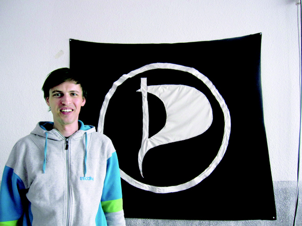 독일 해적당 대표 후보 안드레아스 바움이 9월26일 모자가 달린 편안한 옷차림으로 당사 벽에 걸린 해적당 깃발 아래에서 자세를 취하고 있다.