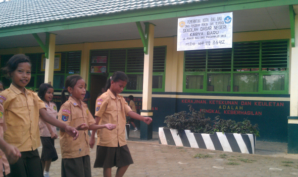 인도네시아 술라웨시주의 바우바우시에 있는 찌아찌아족 마을 소라월리오의 카르야바루 국립초등학교에 한글로 표기된 팻말이 보인다.