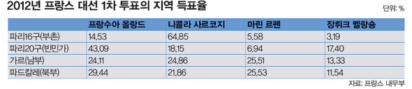 높은 실업률은 ‘국수주의’ 토양 도시와 농촌에서도 ‘기존 공식’이 통하지 않기는 마찬가지였다. 대선 1차 투표 최종 개표 결과, 마린 르펜은 주요 대도시에서 10%의 지지율을 채 넘기지 못했다. 이른바 ‘계급투표’ 성향이 가장 명확한 파리의 경우만 해도, 부유층이 많이 사는 16구에서 사르코지가 64.85%의 지지를 받은 반면, 르펜은 5.58%의 지지만 받았다. 빈곤층이 많이 사는 20구에서도 올랑드가 43.09%의 지지를 받은 반면, 르펜은 6.94%의 지지를 받았을 뿐이다. 그러나 지방으로 가면 사정은 완전히 달라진다. 프랑스 남부 가르 지방에서 마린 르펜은 25.51%의 지지율을 올려, 24.86%를 얻은 사르코지와 24.11%를 얻은 올랑드를 모두 제치고 1위에 올랐다. 이뿐이 아니다. 르펜은 프랑스 북부 파드칼레 지방에서도 25.53%, 동부 모젤 지방에서도 24.73%를 얻는 등 전국적으로 대도시를 제외한 다수의 농촌 지역에서 골고루 높은 지지를 확보하는 데 성공했다. 이런 결과를 두고 마린 르펜이 얻은 청년·농민·노동자들의 표심은 프랑스의 체감경기 악화와 높은 실업률에 기인한다고 보는 시각이 많다. 신자유주의적 세계화로 인한 국내 경제 문제의 해법으로, 극우정당이 내세운 ‘국수주의’라는 위험한 선택지를 대중이 받아들이고 있다는 것이다. 이번에 르펜의 지지율이 급등한 지방들이 대부분 저가의 신흥국 상품에 밀려 공장 문을 닫거나 해외 이전한 공장이 많은 ‘반농반공’(半農半工) 지역이었다는 점이 이를 방증한다. 문제는 이런 움직임이 극우 이념의 전형적 귀결점인 새로운 이민자에 대한 적대심과 기존 이민자에 대한 배척의 심화로 나타난다는 점이다. 2년 전 파리에서 재불 중국인 2만여 명이 치안 불안을 이유로 거리에 나서 대규모 시위를 벌인 것도 이런 맥락에서 다시 주목받고 있다. 당시 프랑스 언론은 기존 무슬림 이민자와 새로운 중국계 이민자의 ‘게토 갈등’ 정도로 치부했었다. 하지만 사실 근본적인 문제는 프랑스 사회에서 무슬림 이민자에 대한 편견이 전례 없이 중국계 이민자에게까지 확산되고 있다는 점이다.