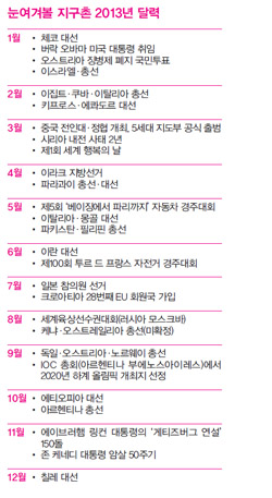 경제위기가 심각해진 2010년에도 GDP의 2.2%를 국방 예산에 사용했던 그리스는 2012년에도 EU 27개 회원국 가운데 GDP 대비 국방 예산 비율이 세 번째로 높았다. <로이터통신> 등 외신은 “EU 차원의 긴축재정 계획 가운데 그리스 좌파 진영이 유일하게 찬성할 만한 사안”이라고 전했다. 현재 EU 27개 회원국 가운데 징병제를 유지하고 있는 나라는 키프로스·핀란드·덴마크 등 6개국에 불과하다. 3월20일, 유엔 선정 제1회 ‘세계 행복의 날’ 중동에서도 새해 벽두부터 선거 바람이 거세게 불 전망이다. 이스라엘이 1월22일 총선을 치르는 데 이어, 중동 민주화의 무풍지대로 남아 있는 요르단에서도 1월23일 총선이 예정돼 있다. 최근 국민투표를 거쳐 새 헌법이 통과된 이집트에서도 2월 중순 이전에 총선을 치르게 된다. 무함마드 무르시 대통령과 야권의 대립 속에 파열음을 내고 있는 이집트의 민주화가 다시 한번 시험대에 서게 될 터다. 3월의 지구촌에는 뉴스가 넘쳐날 모양새다. 중국에선 이른바 ‘양회’로 불리는 전국인민대표대회(전인대)와 전국인민정치협상회의(정협)가 열린다. 이를 통해 시진핑 주석·리커창 총리를 쌍두마차로 하는 중국의 5세대 지도부가 공식 출범하게 된다. 2011년 ‘아랍의 봄’과 함께 대대적인 반정부 시위로 시작된 시리아의 내전 사태는 3월15일로 만 2년을 맞는다. 2012년 12월23일 중부 할파야 지역에서 식료품을 구하려고 길게 줄을 늘어선 시민을 겨냥한 정부군의 공습으로 수십 명이 목숨을 잃는 등 시리아 사태는 여전히 끝이 보이지 않는다. 피의 학살은 언제나 잦아들 것인가? 본격적인 봄의 시작을 알리는 ‘춘분’인 3월20일은 유엔이 정한 제1회 ‘세계 행복의 날’이다. ‘세계에서 가장 행복한 나라’로 알려진 히말라야의 작은 나라 부탄이 퍼뜨린 ‘행복 바이러스’가 지구촌 전체로 확산될 수 있을지 지켜볼 일이다. 4월로 예정된 이라크의 지방선거는 미군 철수 이후 서로에 대한 삿대질을 멈추지 않고 있는 시아파와 수니파, 쿠르드족의 상생 가능성을 점쳐보는 계기가 될 터다. 5월과 6월엔 특별한 ‘경주대회’를 만날 수 있다. 5월28일엔 중국 베이징에서 세계 최장거리 자동차 경주대회가 열린다. ‘베이징에서 파리까지’란 이름의 이 대회는 1907년 첫 대회 이래 이번이 다섯 번째란다. 베이징을 출발해 몽골과 러시아를 거쳐, 우크라이나~슬로바키아~오스트리아~스위스를 경유해 프랑스 파리까지 33일간 내달리게 될 이 대회는 무려 1만2247km에 이르는 대장정이다. 6월29일엔 세계 최고 권위를 자랑하는 자전거 경주대회 ‘투르 드 프랑스’가 100번째 개막을 알린다. 일본 자민당 7월 참의원 선거서도 과반? 6월엔 대통령 선거를 치르는 이란을 주목해보자. 2009년 대선 당시 개혁파인 미르호세인 무사비 전 총리가 마무드 아마디네자드 대통령에게 예상 밖의 ‘완패’를 당한 뒤 불거진 민주화 시위를 기억할 필요가 있다. 무사비 전 총리를 상징하는 초록색이 거리에서 물결을 이뤄 ‘녹색혁명’으로 불린 당시의 시위 사태는 결국 미완의 혁명으로 허리가 꺾였었다. 올 대선에서 아마디네자드 대통령은 연임 제한 규정에 따라 출마가 불가능하다. 2011년 ‘중동의 봄’ 시작과 함께 가택연금에 처해진 무사비 전 총리는 출마 포기를 선언했다. 최고지도자인 아야톨라 알리 하메네이가 이끄는 강경파가 집권을 연장할 것인가, 모하마드 하타미 대통령에 이어 개혁파가 다시 권력의 전면에 등장할 것인가? 핵개발 프로그램 탓에 경제제재를 받고 있는 이란 대선의 향배는 중동은 물론 지구촌 전역에까지 파장을 미칠 수밖에 없다. 7월엔 일본에서 상원 격인 참의원 선거가 예정돼 있다. 2012년 12월16일 치러진 중의원 선거에서 압승을 거둔 자민당이 참의원에서도 과반 의석을 확보한다면, 아베 신조 총리 정부는 ‘롱런’의 발판을 마련하게 된다. 반대로 과반 의석 확보에 실패할 경우, 아베 총리의 앞길은 가시밭길이 될 공산이 크다. 2007년 이후 일본에선 평균 1년에 한 번꼴로 총리가 바뀌었다. 같은 달 옛 유고연방의 크로아티아는 오랜 기다림 끝에 EU의 28번째 회원국이 된다. 9월엔 유럽발 소식이 많아질 것으로 보인다. 독일과 오스트리아, 노르웨이에서 잇따라 총선이 치러지기 때문이다. 특히 끝 모를 경제위기 속에 유럽을 떠받치고 있는 독일 총선에 관심이 집중될 수밖에 없어 보인다. 현재로선 앙겔라 메르켈 총리가 이끄는 기독민주당(CDU)이 여론조사에서 제1야당인 사회민주당(SPD)을 두 자릿 수 이상으로 앞서고 있다. 헬무트 콜 총리에 이어 1998년 기독민주당 대표에 오른 메르켈 총리는 이후 치러진 7차례 연방선거에서 6차례나 승리를 거둔 ‘선거의 여왕’이다. 9월7일엔 일본과 스페인, 터키 국민의 관심이 아르헨티나의 수도 부에노스아이레스에 집중될 터다. 국제올림픽위원회(IOC)가 그날 제125차 총회를 열고, 2020년 하계 올림픽 개최 도시를 발표하기 때문이다. 치열한 접전을 펼치고 있는 일본 도쿄와 스페인 마드리드, 터키 이스탄불 가운데 한 곳은 브라질의 리우데자네이루에 이어 제32회 올림픽을 유치하게 된다. 11월 미국에선 역사 공부 열기가 후끈 달아오를 듯싶
