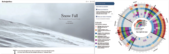 미국 온라인판의 ‘스노폴’ 기사(왼쪽)는 디지털 시대의 새로운 스토리텔링 가능성을 보여줬다. 오른쪽은 데이터 저널리즘의 모범을 구현한 영국 온라인판 ‘동성애자 권리’ 기사의 메인 화면.