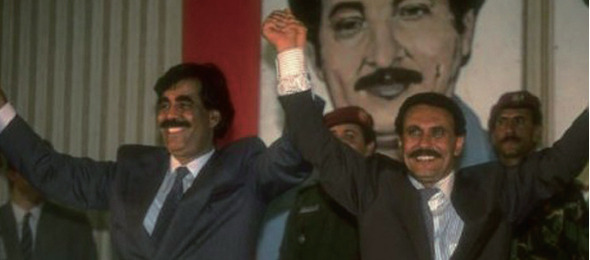 남예멘의 사회당 대표 알리 살렘 알베이드(왼쪽)와 북예멘의 알리 압둘라 살레 대통령이 1990년 5월22일 통일헌법에 합의한 뒤 손을 들어 보이고 있다.한겨레 자료