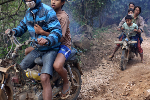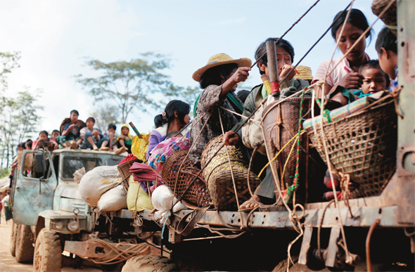 카친의 비정부기구(NGO)들이 피란민 수송을 위해 제공한 구형 트럭들에는 안전장치가 없다. 피란민들은 짐칸 위에 얼기설기 엮은 밧줄에 의지해 험한 산길을 오간다.