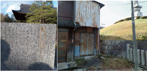 고류지 태자전 앞 비석. 창건자 이름 앞에 수식어로 보이는 몇 글자가 지워져 있다(왼쪽). 임진왜란 때 조선과 명나라 희생자들의 귀와 코를 묻은 무덤이 민가 옆에 거의 방치돼 있다.