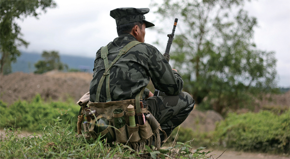 카친 반군의 수도인 라이자를 방어하는 라와양 전선에서 반군 병사가 휴식을 취하고 있다.